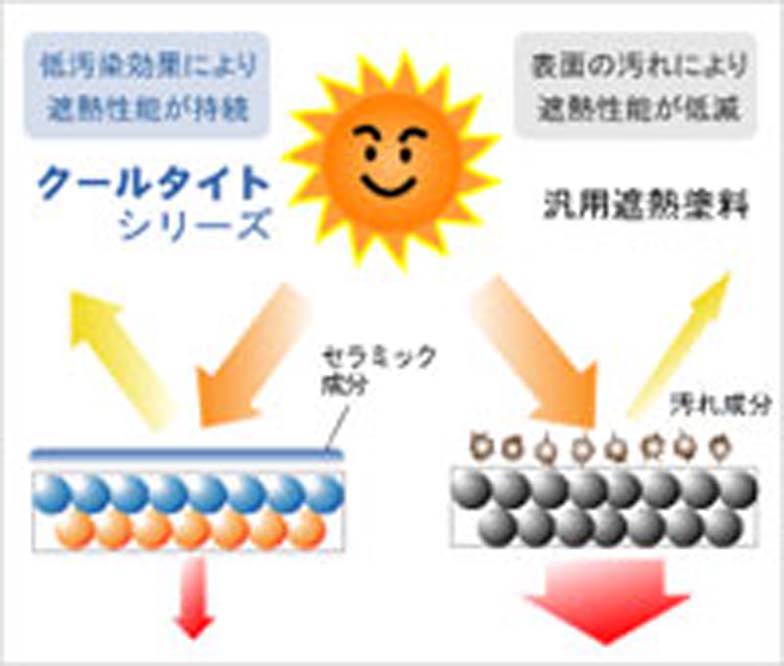 特殊顔料により近赤外線(熱線)領域の波長の光線を反射し、透過する熱量を減少させます。また、汚れの付着による遮熱効果の低下を防ぎます。